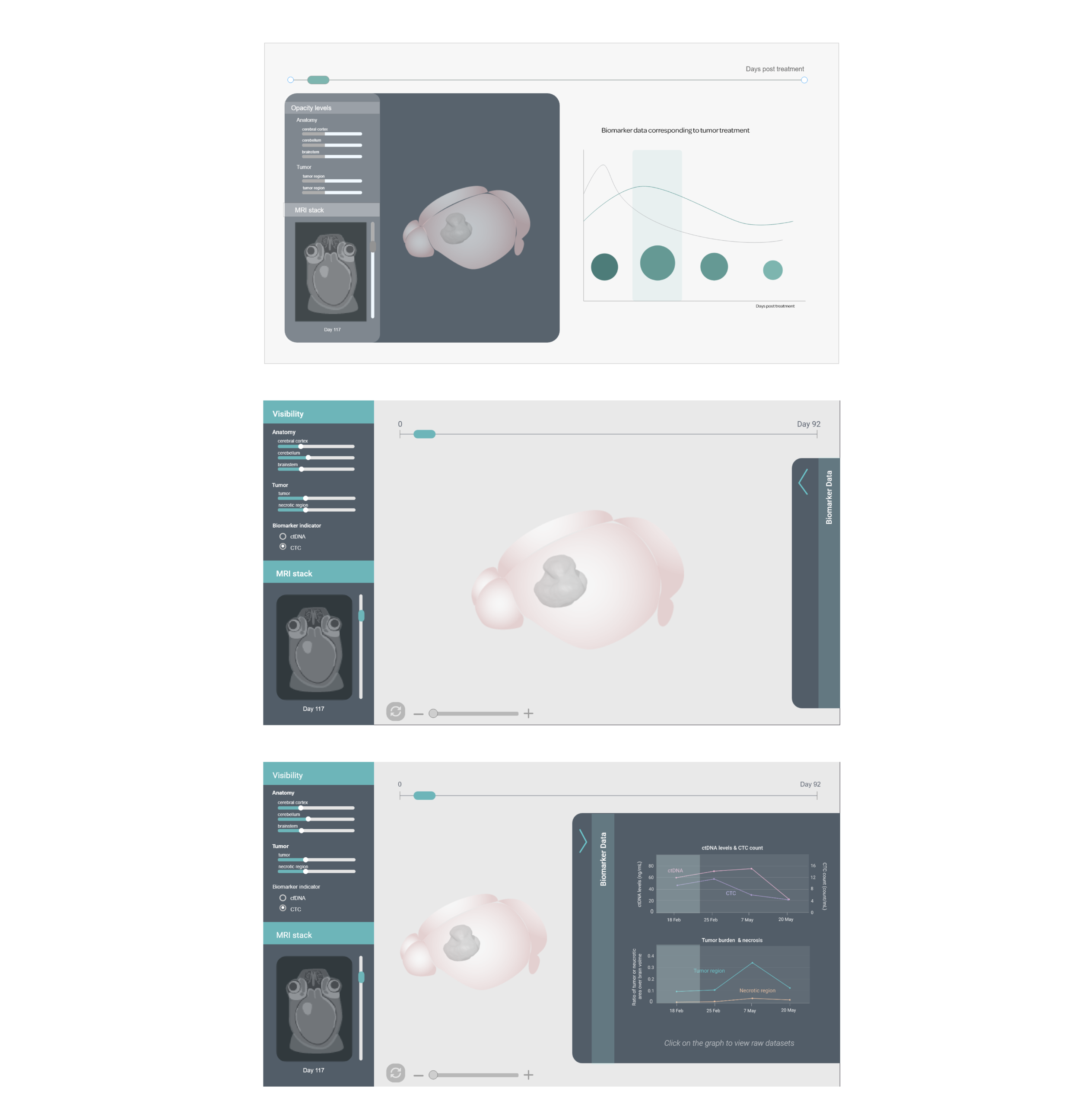 Wireframes for the interactive platform were carefully designed to allow incorporation of multiple types of data so that the platform can be a comprehensive visualization tool. The UI of the platform was revised multiple times to ensure smooth navigation of tumor 3D data, MRI scans and fluid biomarker data over time.